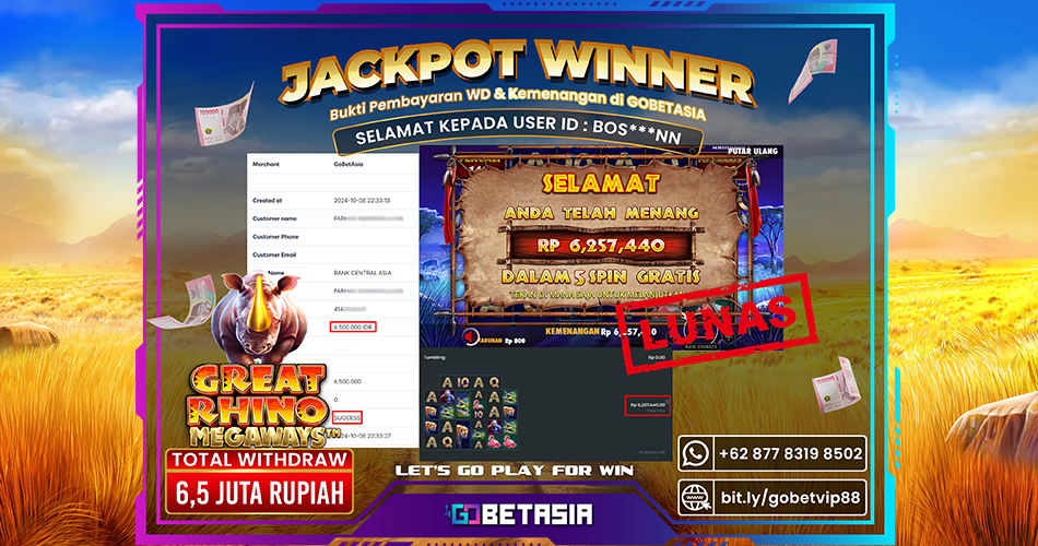 Badak ngamuk yaa Bosku BOS***NN sampe JEPE 6.500.000 dong. Mantul bener dah ah, tipis tipis tetap masih cuan aja kalo di GOBETASIA. Jangan kasih kendor boskuhhhhh !! Sehat selalu yah bosku.