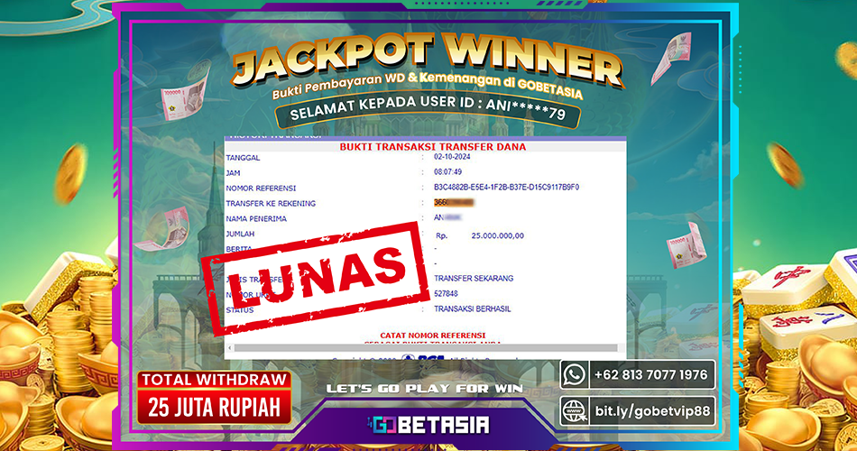 GOBETASIA hadir dengan bukti pembayaran nyata, sistem yang transparan, dan pelayanan profesional. Bukan hanya janji manis, tapi benar-benar membayar setiap kemenangan, termasuk JACKPOT besar, tanpa drama dan tanpa risiko akun diblokir.