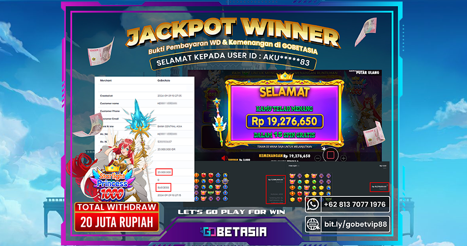Banyak member kami yang sudah merasakan kemenangan besar. Dari bonus kecil hingga jackpot puluhan juta, bisa dicapai siapa saja. Salah satunya, kemenangan member ini hanyalah contoh nyata dari banyak kisah sukses di GOBETASIA. Gabung hari ini dan bawa pulang kemenanganmu!