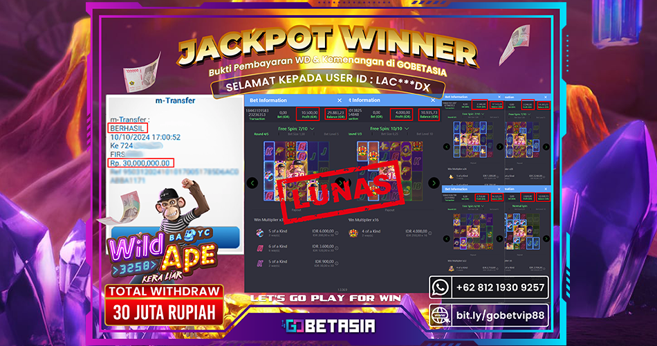 Cuan dari monyet liar cuyyy. Gak tanggung tanggung ya Boskuhhh LAC***DX. Udah lama gabung juga tetap di manja yah bosku sama GOBETASIA. Emang gak salah lagi pilihannya mau member lama mau member baru pasti JEPE. Semangat terussss ya boskuuhh, sehat trosss bossss !!
