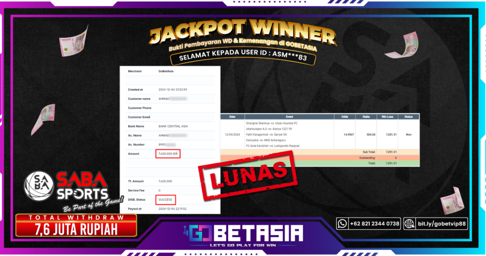 Thank you for reading this post, don't forget to subscribe!Dengan bukti pembayaran ini kami menyatakan bahwa GOBETASIA adalah bandar terpercaya 100% PASTI BAYAR. Dengan pembayaran ini kami berani menjamin bahwa setiap kemenangan yang anda dapatkan bermain di GOBETASIA akan dibayar secara lunas tanpa adanya embel-embel pemblokiran akun.