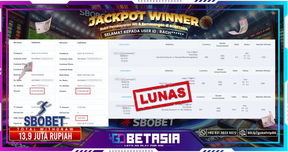 Dengan bukti pembayaran ini kami menyatakan bahwa GOBETASIA adalah bandar terpercaya 100% PASTI BAYAR. Dengan pembayaran ini kami berani menjamin bahwa setiap kemenangan yang anda dapatkan bermain di GOBETASIA akan dibayar secara lunas tanpa adanya embel-embel pemblokiran akun.