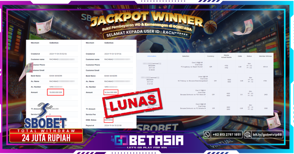 Dengan bukti pembayaran ini kami menyatakan bahwa GOBETASIA adalah bandar terpercaya 100% PASTI BAYAR. Dengan pembayaran ini kami berani menjamin bahwa setiap kemenangan yang anda dapatkan bermain di GOBETASIA akan dibayar secara lunas tanpa adanya embel-embel pemblokiran akun.