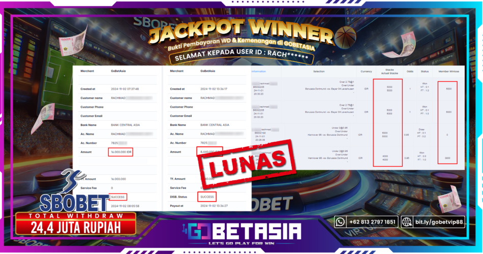 Dengan bukti pembayaran ini kami menyatakan bahwa GOBETASIA adalah bandar terpercaya 100% PASTI BAYAR. Dengan pembayaran ini kami berani menjamin bahwa setiap kemenangan yang anda dapatkan bermain di GOBETASIA akan dibayar secara lunas tanpa adanya embel-embel pemblokiran akun.