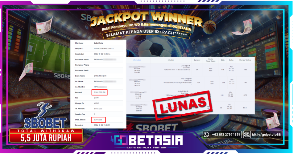 Dengan bukti pembayaran ini kami menyatakan bahwa GOBETASIA adalah bandar terpercaya 100% PASTI BAYAR. Dengan pembayaran ini kami berani menjamin bahwa setiap kemenangan yang anda dapatkan bermain di GOBETASIA akan dibayar secara lunas tanpa adanya embel-embel pemblokiran akun.