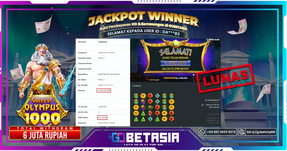 Mayan tipis tipis dapat dari Khong Zeus di kasih M4XW1N 6.000.000 bisa lah buat malam mingguan yakan Bosku DA***83. Jangan lupa traktir traktir yang lain ya bosku. Sehat selalu bosku