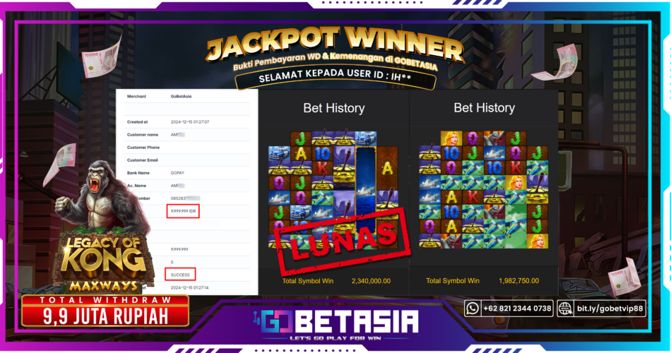 Dengan bukti pembayaran ini, kami dengan tegas menyatakan bahwa GOBETASIA adalah bandar terpercaya 100% PASTI BAYAR. Selain itu, dengan pembayaran ini kami juga berani menjamin bahwa setiap kemenangan yang Anda raih saat bermain di GOBETASIA akan dibayar secara lunas tanpa adanya embel-embel pemblokiran akun.Dengan kata lain, kami memastikan Anda dapat menikmati kemenangan tanpa halangan apapun.
