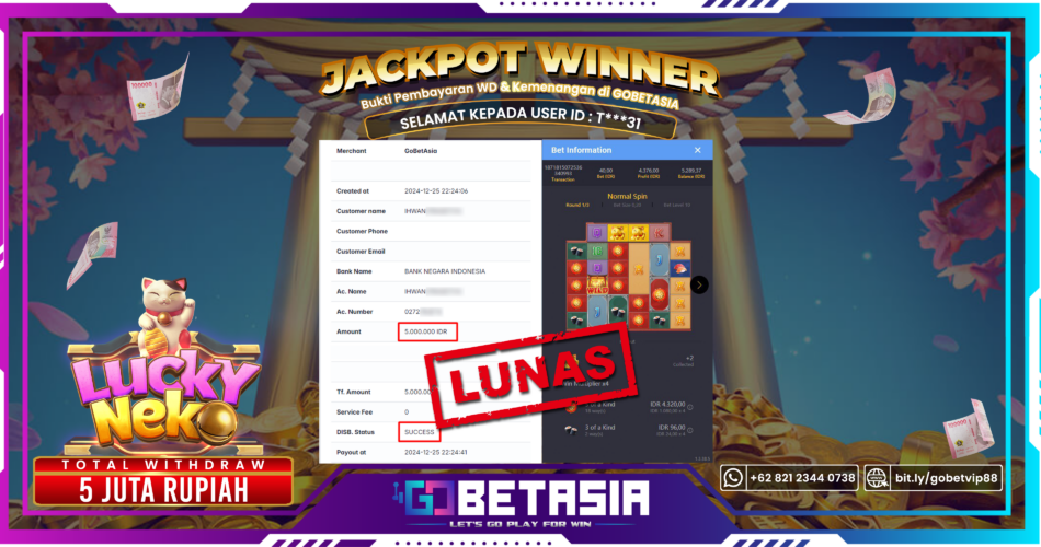 Dengan bukti pembayaran ini, kami dengan tegas menyatakan bahwa GOBETASIA adalah bandar terpercaya 100% PASTI BAYAR. Selain itu, dengan pembayaran ini kami juga berani menjamin bahwa setiap kemenangan yang Anda raih saat bermain di GOBETASIA akan dibayar secara lunas tanpa adanya embel-embel pemblokiran akun.Dengan kata lain, kami memastikan Anda dapat menikmati kemenangan tanpa halangan apapun.