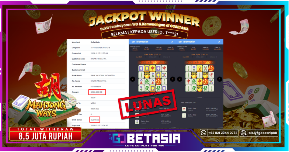 Dengan bukti pembayaran ini kami menyatakan bahwa GOBETASIA adalah bandar terpercaya 100% PASTI BAYAR. Dengan pembayaran ini kami berani menjamin bahwa setiap kemenangan yang anda dapatkan bermain di GOBETASIA akan dibayar secara lunas tanpa adanya embel-embel pemblokiran akun.