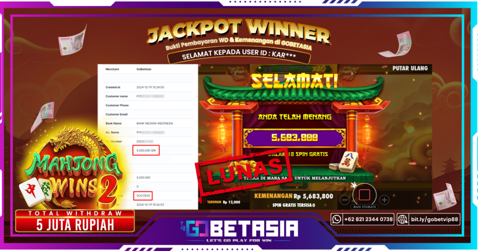 Dengan bukti pembayaran ini, kami dengan tegas menyatakan bahwa GOBETASIA adalah bandar terpercaya 100% PASTI BAYAR. Selain itu, dengan pembayaran ini kami juga berani menjamin bahwa setiap kemenangan yang Anda raih saat bermain di GOBETASIA akan dibayar secara lunas tanpa adanya embel-embel pemblokiran akun.Dengan kata lain, kami memastikan Anda dapat menikmati kemenangan tanpa halangan apapun.