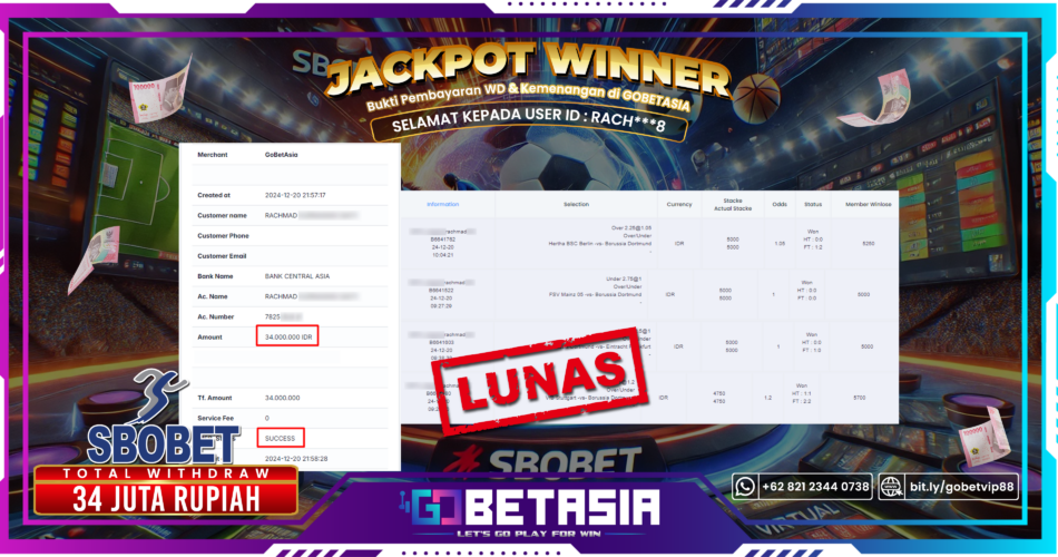 Thank you for reading this post, don't forget to subscribe!Dengan bukti pembayaran ini, kami dengan tegas menyatakan bahwa GOBETASIA adalah bandar terpercaya 100% PASTI BAYAR. Selain itu, dengan pembayaran ini kami juga berani menjamin bahwa setiap kemenangan yang Anda raih saat bermain di GOBETASIA akan dibayar secara lunas tanpa adanya embel-embel pemblokiran akun.Dengan kata lain, kami memastikan Anda dapat menikmati kemenangan tanpa halangan apapun.