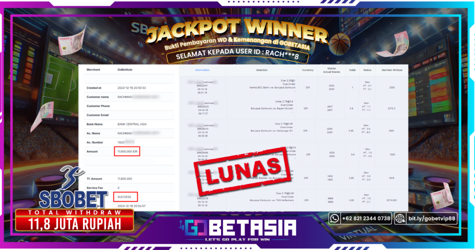 Dengan bukti pembayaran ini, kami dengan tegas menyatakan bahwa GOBETASIA adalah bandar terpercaya 100% PASTI BAYAR. Selain itu, dengan pembayaran ini kami juga berani menjamin bahwa setiap kemenangan yang Anda raih saat bermain di GOBETASIA akan dibayar secara lunas tanpa adanya embel-embel pemblokiran akun.Dengan kata lain, kami memastikan Anda dapat menikmati kemenangan tanpa halangan apapun.