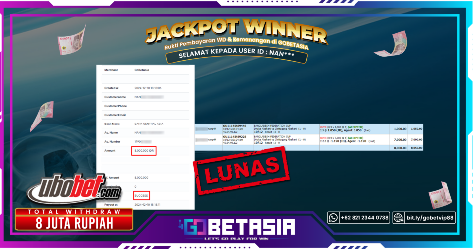 Dengan bukti pembayaran ini kami menyatakan bahwa GOBETASIA adalah bandar terpercaya 100% PASTI BAYAR. Dengan pembayaran ini kami berani menjamin bahwa setiap kemenangan yang anda dapatkan bermain di GOBETASIA akan dibayar secara lunas tanpa adanya embel-embel pemblokiran akun.